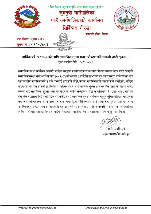 आर्थिक वर्ष २०८२/८३ को लागि सामाजिक सुरक्षा भत्ता नवीकरण गर्ने सम्बन्धी जरुरी सूचना