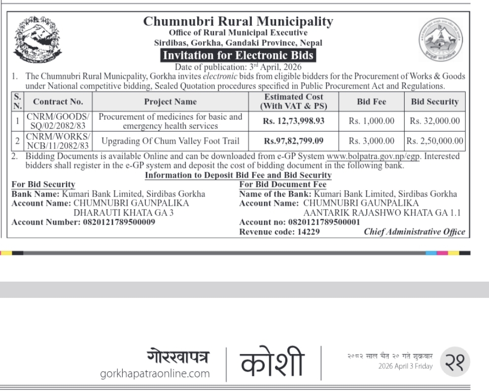चुम भ्याली पदमार्ग स्तरोन्नति र औषधि खरिद सम्बन्धी बोलपत्र आह्वान गरिएको सूचना